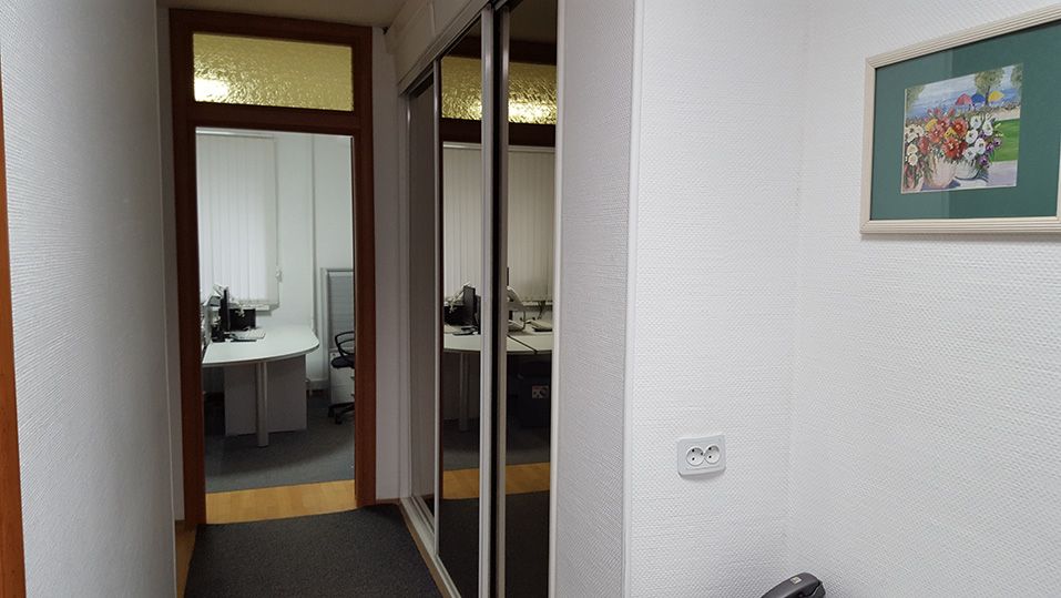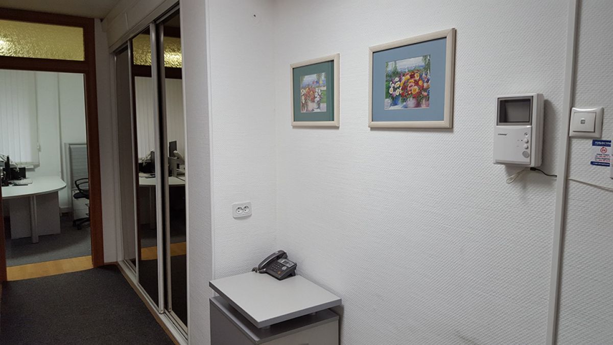 В коридоре офиса расположен большой 3-секционный встроенный шкаф для верхней одежды и обуви, с отделением с полками для папок, офисной техник и других материалов. Рядом с входной дверью находится тревожная кнопка и пульт сигнализации, а также электрический щиток с предохранителями. Рядом с дверью есть небольшая тумбочка и стулья для гостей, а также большой шредер для бумаг.