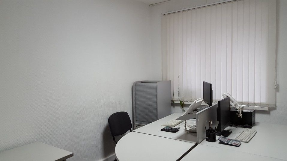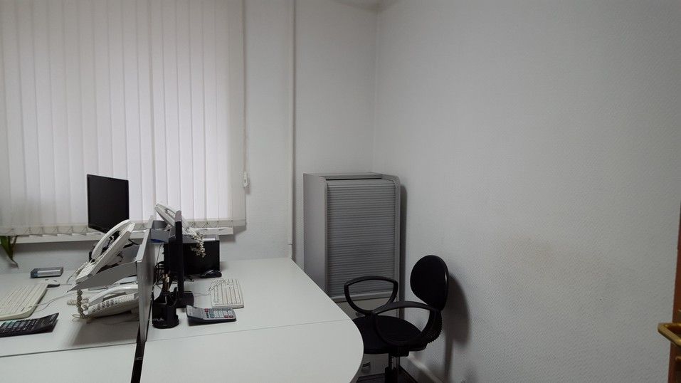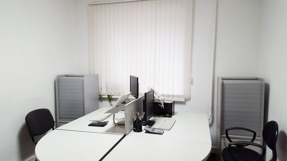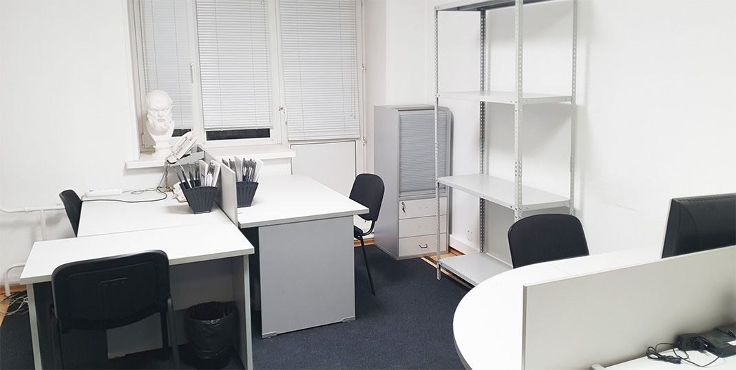 В большой комнате можно разместить от 4 до 6 сотрудников. Каждое рабочее место оборудован письменным столом, тумбочкой, небольшим стеллажом и перегородкой. К каждому месту подведена телефонная линия на 2-3 аппарата и Ethernet кабель с разветвителем для одновременной работы в Интернете до 5-8 устройств. На полу — паркетная доска и офисный ковролин. Модульная офисная мебель позволяет легко трансформировать расстановку под нужды сотрудников.
